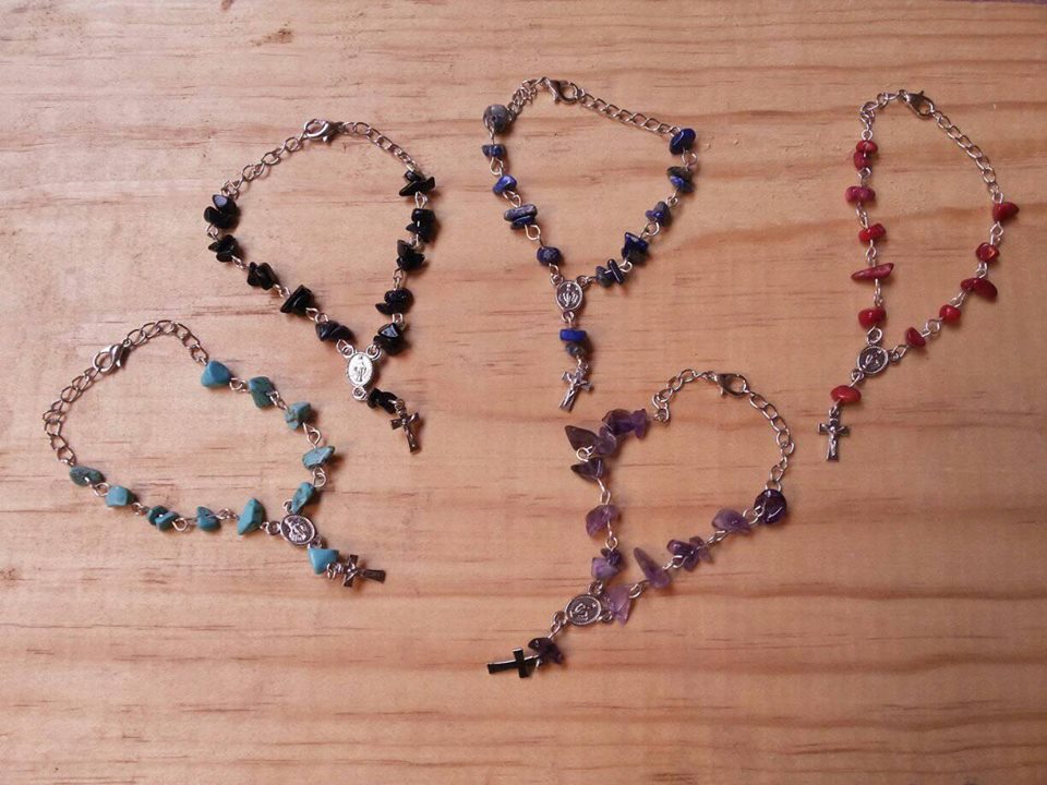 Rosado= CUARZO ROSA. Da bienestard fisica y emocional,seguridad, cura heridas sentimentales  Café = OJO DE TIGRE. Aporta alegria, optimismo, postivismo, libertad                                              Azul= LAPISLAZURI.Ayuda a melancolia, alivia stres, claridad, creatividad, protectora (niños)      Blanco= CUARZO. Piedra de la salud, propiedades curativas y de prevención                              Amarillo= CITRINO. Prosperidad, riqueza, da humor, muy protectora, aumenta autoestima         Verde= AMASONITA. Para la ansiedad, miedos, nervios e inseguridades, elimina energia negativa Celeste= TURQUEZA. Poder curativo depresiones, comunicación,creatividad,memoria,mal de ojo Morado= AMATISTA. Da equilibrio,sinceridad,pureza,espiritualidad,curación,sabiduria,calma dolor,no permite tristeza.